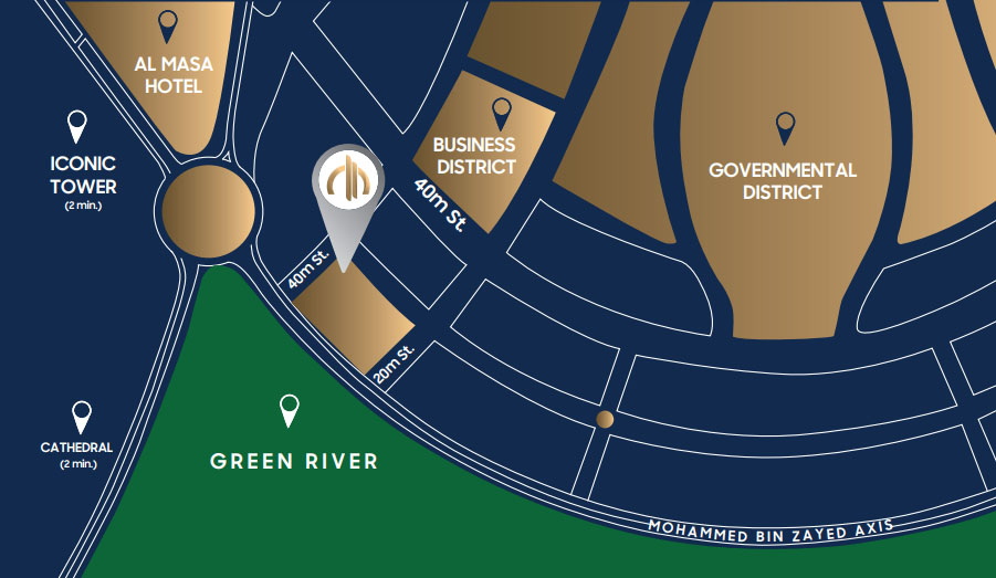 تم تصميم المشروع علي مساحة 21204 متر و هو عبارة عن 3 ادوار تجارية تحت ادارة تيفولي دوم و ينقسم الي برجين يتكون كل منهم الي 30 طابق و يعد ذلك اعلي ابراج العاصمة ارتفاعا بفيو مفتوح 1600 متر عالنهر الاخضر و محور بن زايد الشمالي بأعلي منطقة استثمارا في الداون تاون